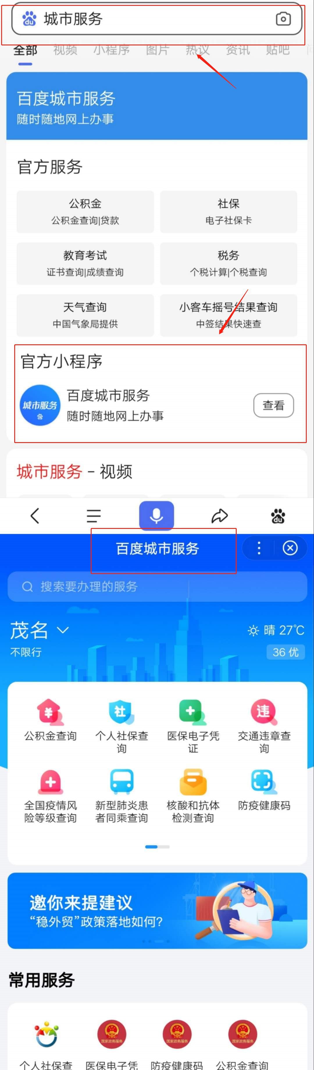 第一步:打开百度,并搜索【城市服务】小程序,进入后再下拉页面找到【教育就业】。