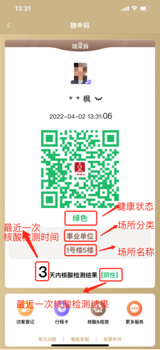 市民进入重点场所时,应当通过“随申办”移动端(APP、小程序)以及微信、支付宝的“扫一扫”功能,扫描重点场所张贴的“场所码”,系统自动完成个人信息和健康状态核验,同时在用户手机页面中可查看健康状态,最近一次核酸检测时间、结果,扫码的场所分类、场所名称等。