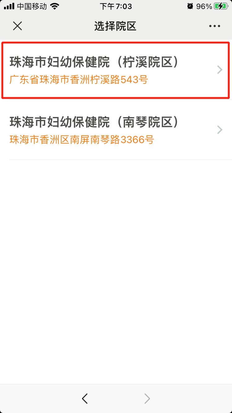点击【珠海市妇幼保健院(柠溪院区)】;