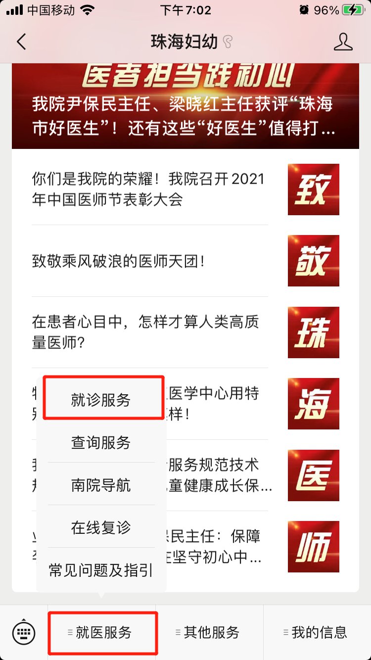 微信搜索进入【珠海市妇幼保健院】公众号,点击菜单栏【就医服务】,选择【就诊服务】;