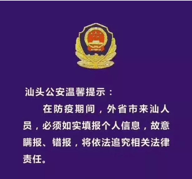 当前正处在新冠肺炎疫情防控的关键时期,为有效控制疫情,严防疫情输入、扩散蔓延,所有外省市来汕人员需进行个人信息填报,汕头市公安局呼吁大家主动配合,详细、如实填写。