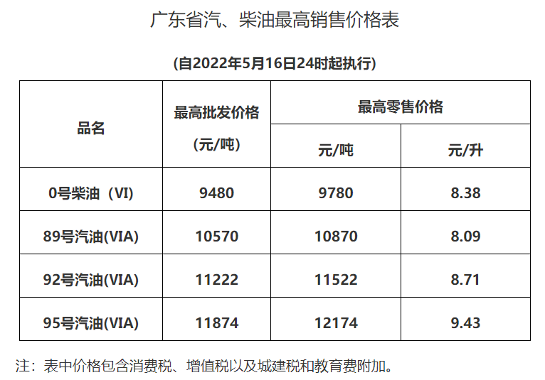 广东省汽、柴油最高销售价格表(2022年5月30日24时起执行)