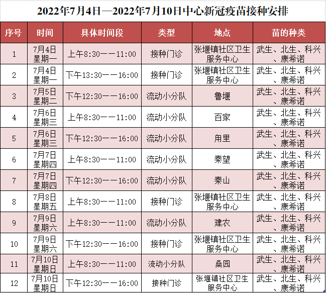为不断筑牢人群免疫屏障,方便群众就近及时接种新冠病毒疫苗,张堰镇社区卫生服务中心将进一步增设新冠病毒疫苗接种场次,现将7月4日至7月10日调整的新冠病毒疫苗接种安排告知如下: