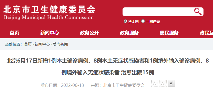 6月17日0时至24时,新增1例本土确诊病例和8例无症状感染者,无新增疑似病例;新增1例境外输入确诊病例和8例无症状感染者,无新增疑似病例。治愈出院15例。