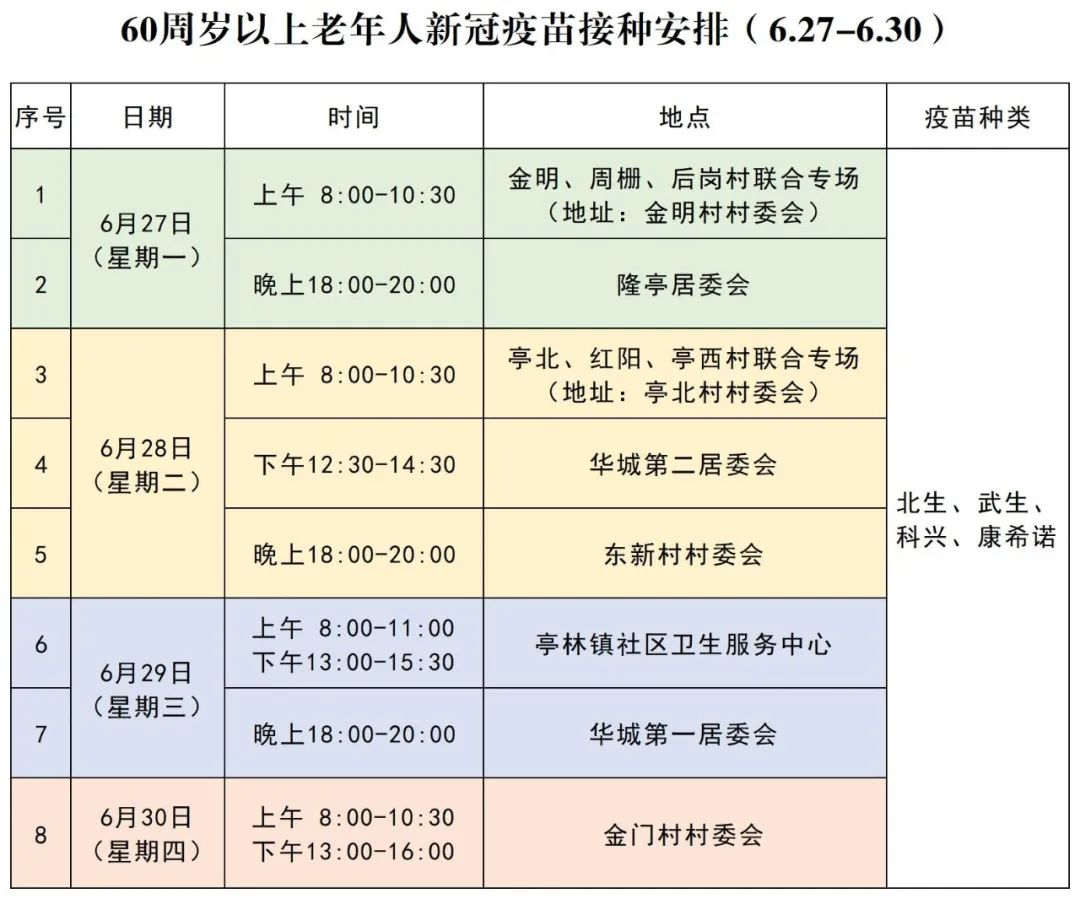 3. 进入亭林镇社区卫生服务中心接种点,需提前在“健康云”APP或小程序预约登记(可让家属或村居委帮助预约),70周岁以上老人需有一位家属或志愿者陪同(陪同人员进入社区要求同上)。