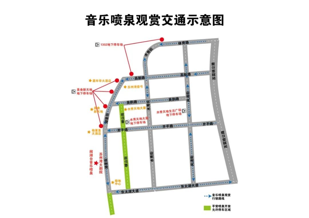 1.喷泉开放期间,游客车辆可停放至高新路1302地下停车场、美食新天地地下停车场、水秀天地大厦地下停车场、水秀天地生活广场地下停车场。