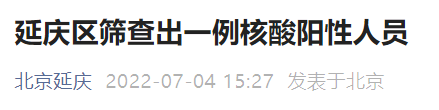 7月4日,延庆区筛查出一例核酸检测阳性人员,为入境隔离期满返京人员。该人员居住地为延庆区八达岭镇长城脚下公社(酒店),7月4日14时37分,核酸检测结果为阳性。目前已转运市定点医院隔离治疗。