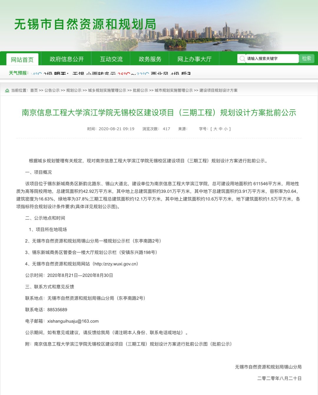 无锡市自然资源和规划局公布了南京信息工程大学滨江学院无锡校区三期工程项目规划方案和规划效果图。
