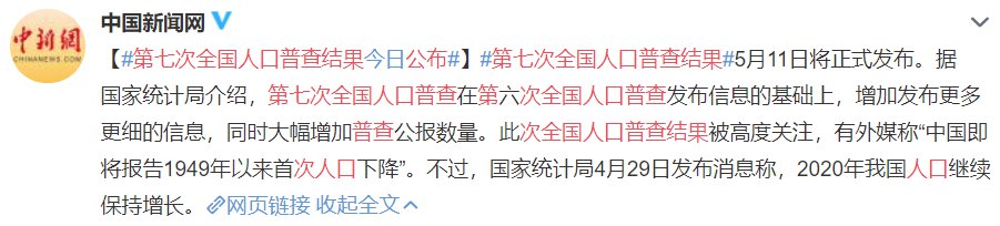 据国家统计局介绍,第七次全国人口普查在第六次全国人口普查发布信息的基础上,增加发布更多更细的信息,同时大幅增加普查公报数量。此次全国人口普查结果被高度关注,有外媒称“中国即将报告1949年以来首次人口下降”。不过,国家统计局4月29日发布消息称,2020年我国人口继续保持增长。