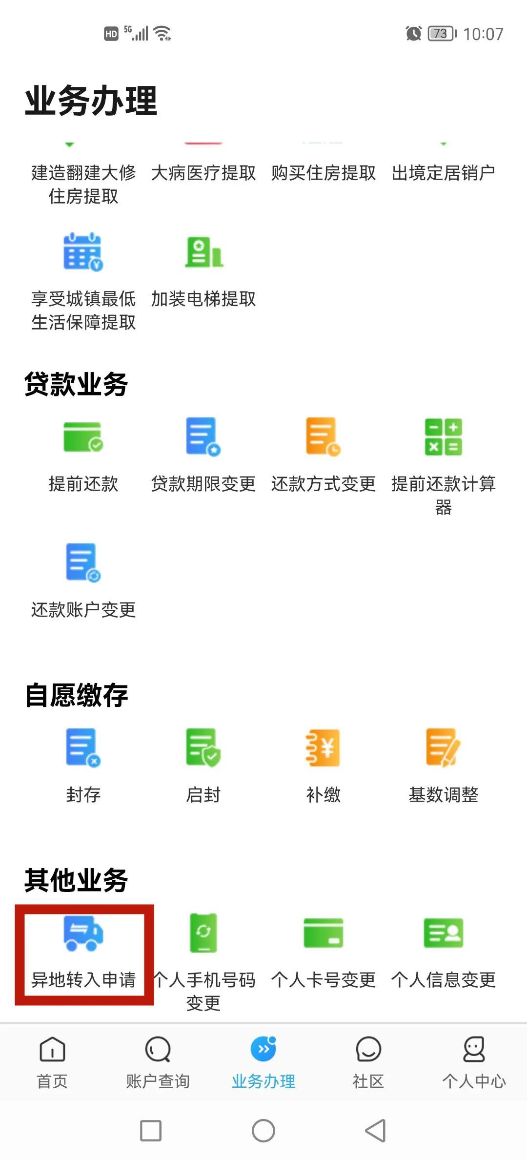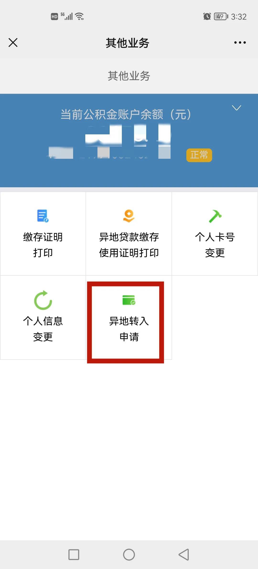 1.打开“手机公积金”APP,选择【其他业务】中的【异地转入申请】。