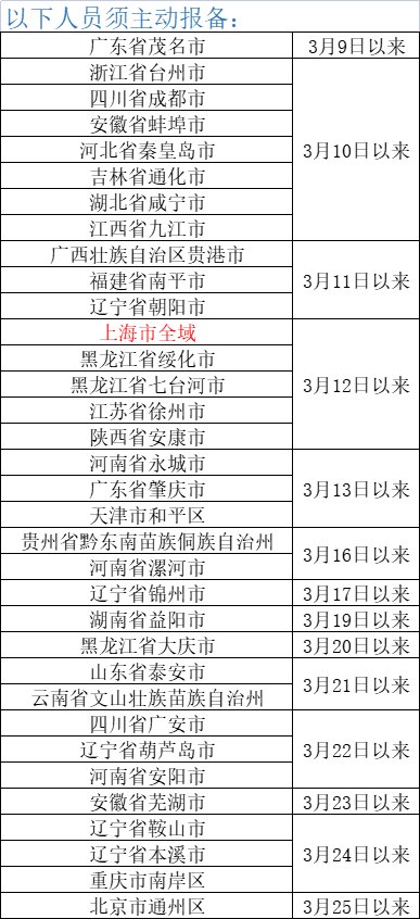 请以下地区来(返)韶人员立即向所在社区(村委)、所在单位、所在酒店报备相关情况,配合当地做好核酸检测等疫情防控措施。对3月12日以来从上海市全域来(返)韶的人员,实行“7天居家隔离+7天居家健康监测”管理。