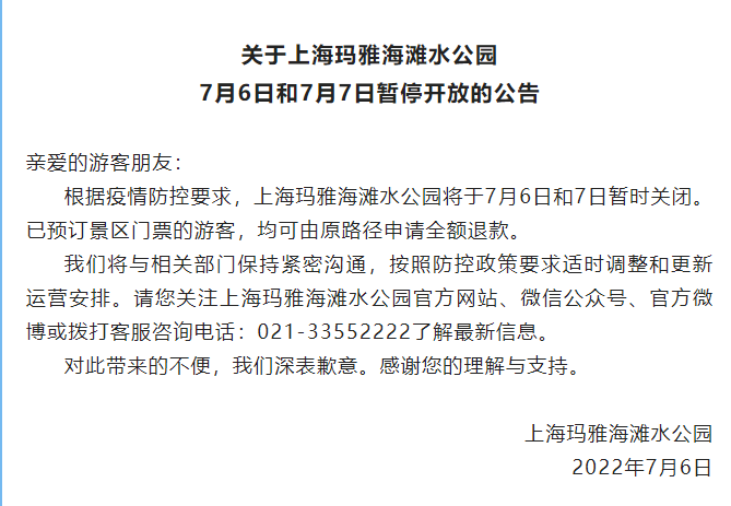 根据疫情防控要求,上海玛雅海滩水公园将于7月6日和7日暂时关闭。已预订景区门票的游客,均可由原路径申请全额退款。