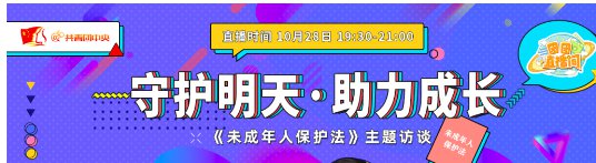 10月28日19:00-20:30,共青团中央直播间邀请了姚建龙、佟丽华、林维、杨丽丽、乌文静等嘉宾和每个青少年朋友聊一聊这部共同关注的法律。守护明天,助力成长,我们一直在路上!