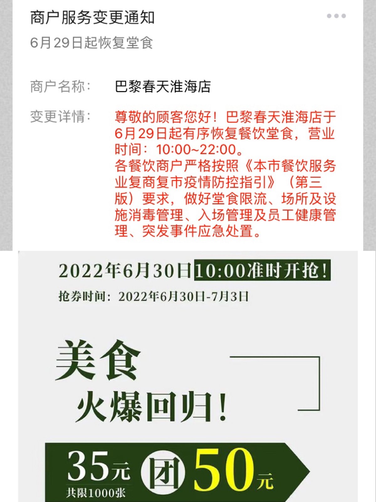 6月29日,巴黎春天淮海店推送了服务通知,明确,6月29日起有序恢复餐饮堂食,营业时间为10:22-22:00。还有35团50的优惠活动哦。