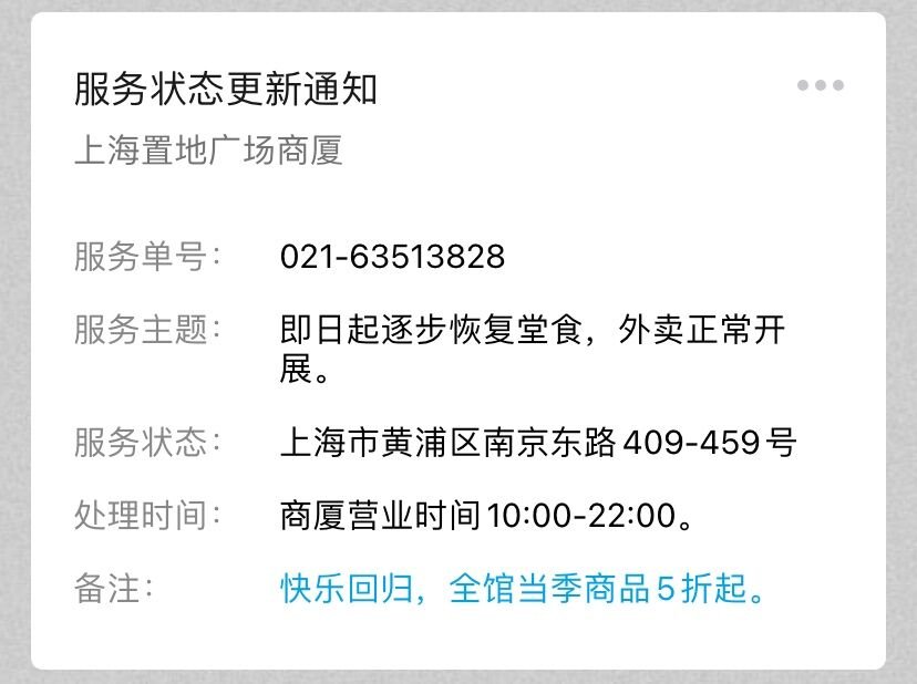6月29日,上海置地广场推送了服务通知,明确,即日起逐步恢复堂食。商厦营业时间为10:22-22:00。