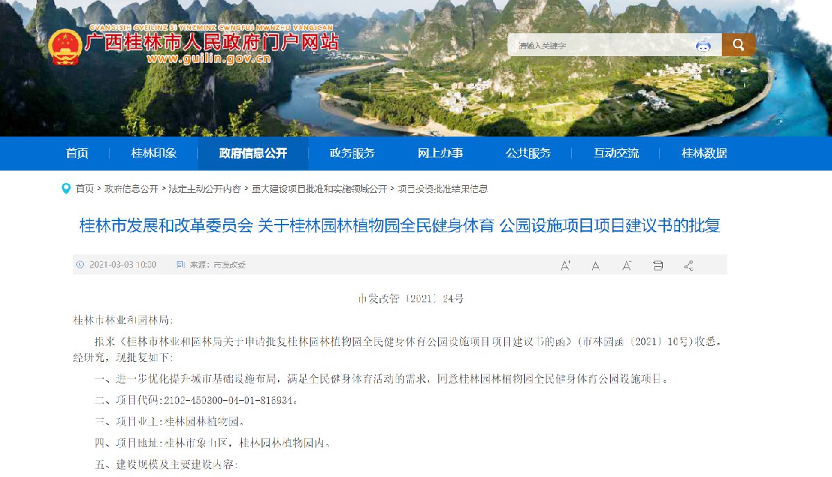 2021年3月,桂林市人民政府网站发布了《桂林市发展和改革委员会 关于桂林园林植物园全民健身体育 公园设施项目项目建议书的批复》,《批复》指出: