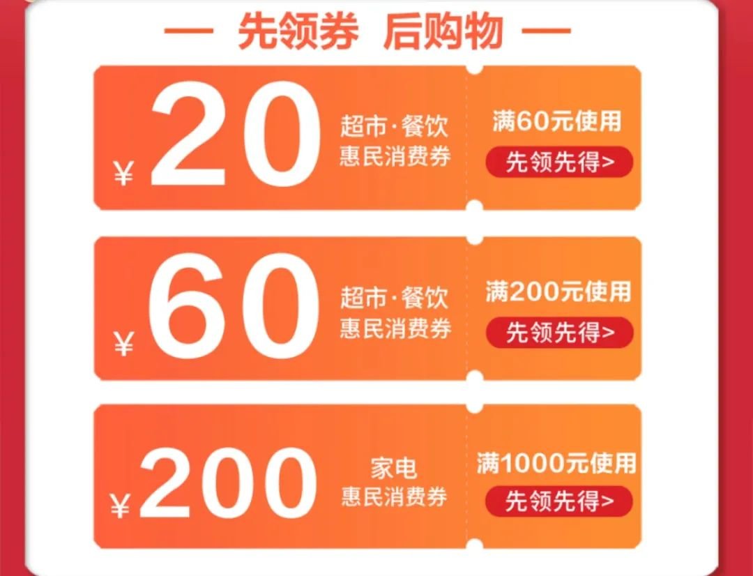 1、200元减60元消费券不低于9100张,60元减20元消费券不低于30200张,1000元减200元消费券不低于1500张。
