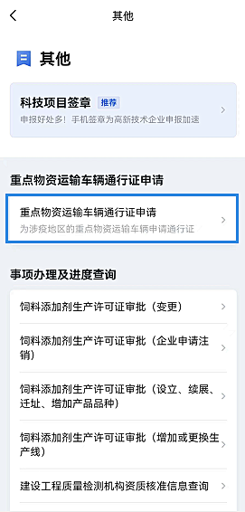 在粤商通APP主界面中查看服务上新,查找到重点物资运输车辆通行证申请(见下图),或选择“服务——按业务分类——选择其他——选择更多”。