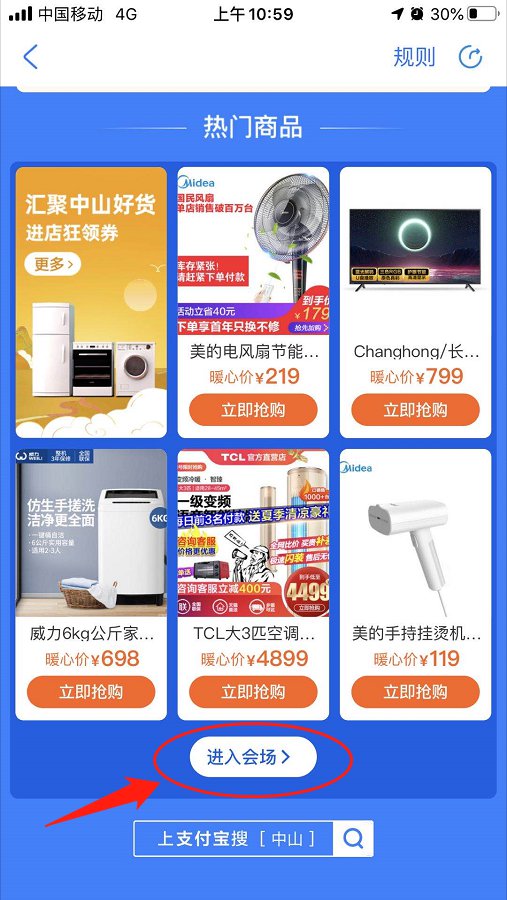 在淘宝天猫“汇聚中山”活动会场。支付宝搜索“中山消费券”,点击进入抢券页面,抢到券之后,往下拉到底部,点击“进入会场”可以查找可使用门店。