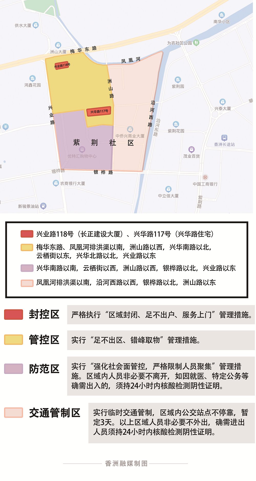 对凤凰河排洪渠以南,沿河西路以西,银桦路以北,洲山路以东,进行临时交通管制,区域内公交站点不停靠,暂定3天。以上区域人员非必要不外出,确需进出人员须持24小时内核酸检测阴性证明。