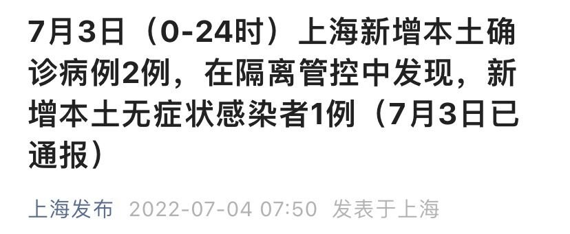 上海市卫健委7月4日通报:2022年7月3日0—24时,新增本土新冠肺炎确诊病例2例和无症状感染者1例,其中2例确诊病例在隔离管控中发现,1例无症状在风险人群筛查中发现,详情如下。
