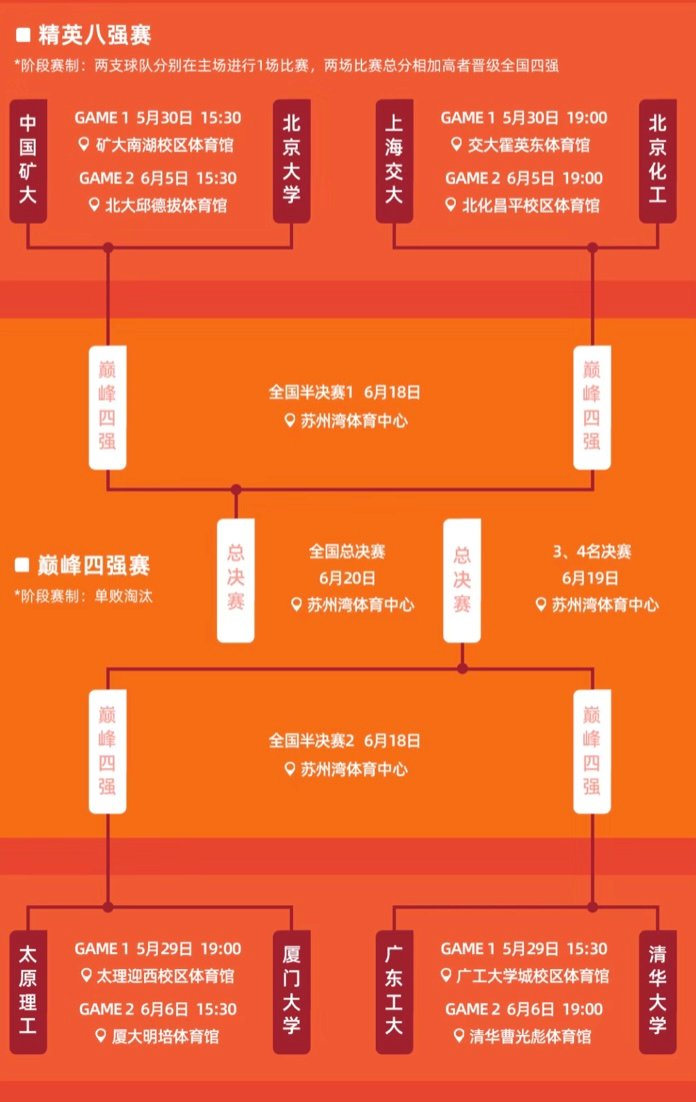 5月25日,CUBA全国大赛八强阶段赛程信息出炉!八支球队将分别回到各自学校,保卫主场!比赛将于本周末(5月29/5月30日)、下周末(6月5/6月6日)开战,具体赛程信息如下: