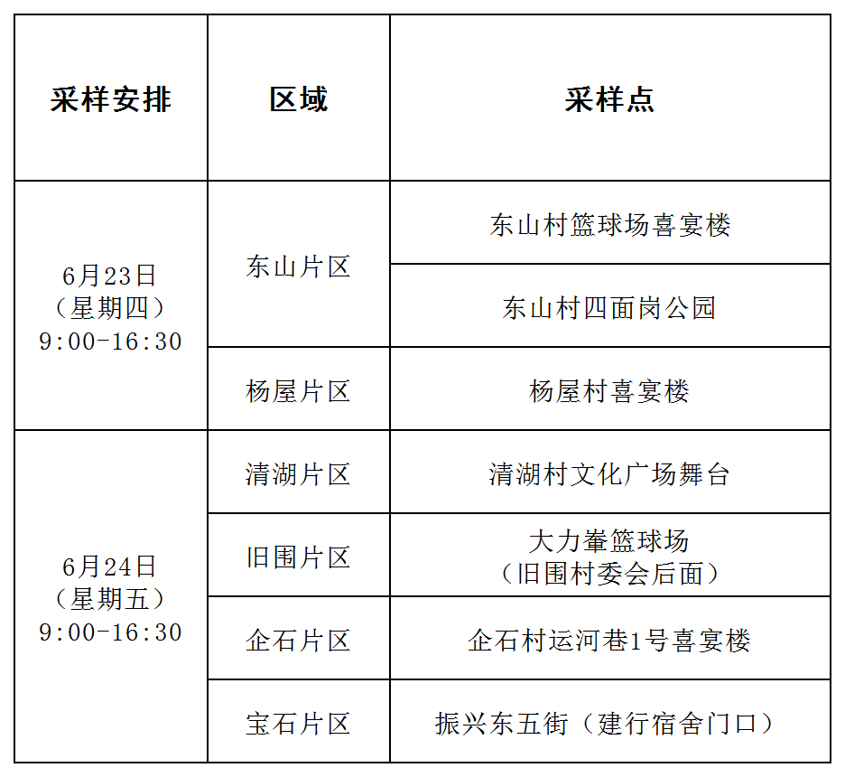 企石镇新冠病毒核酸抽检采样点安排表(6月23日-24日)