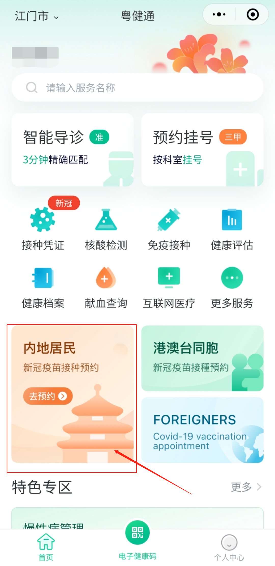 第二步:登录完成后,点击首页的“内地居民新冠疫苗接种预约”,然后依据个人情况,点击个人接种预约;
