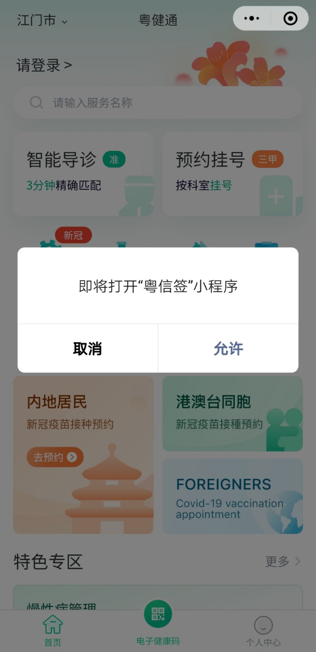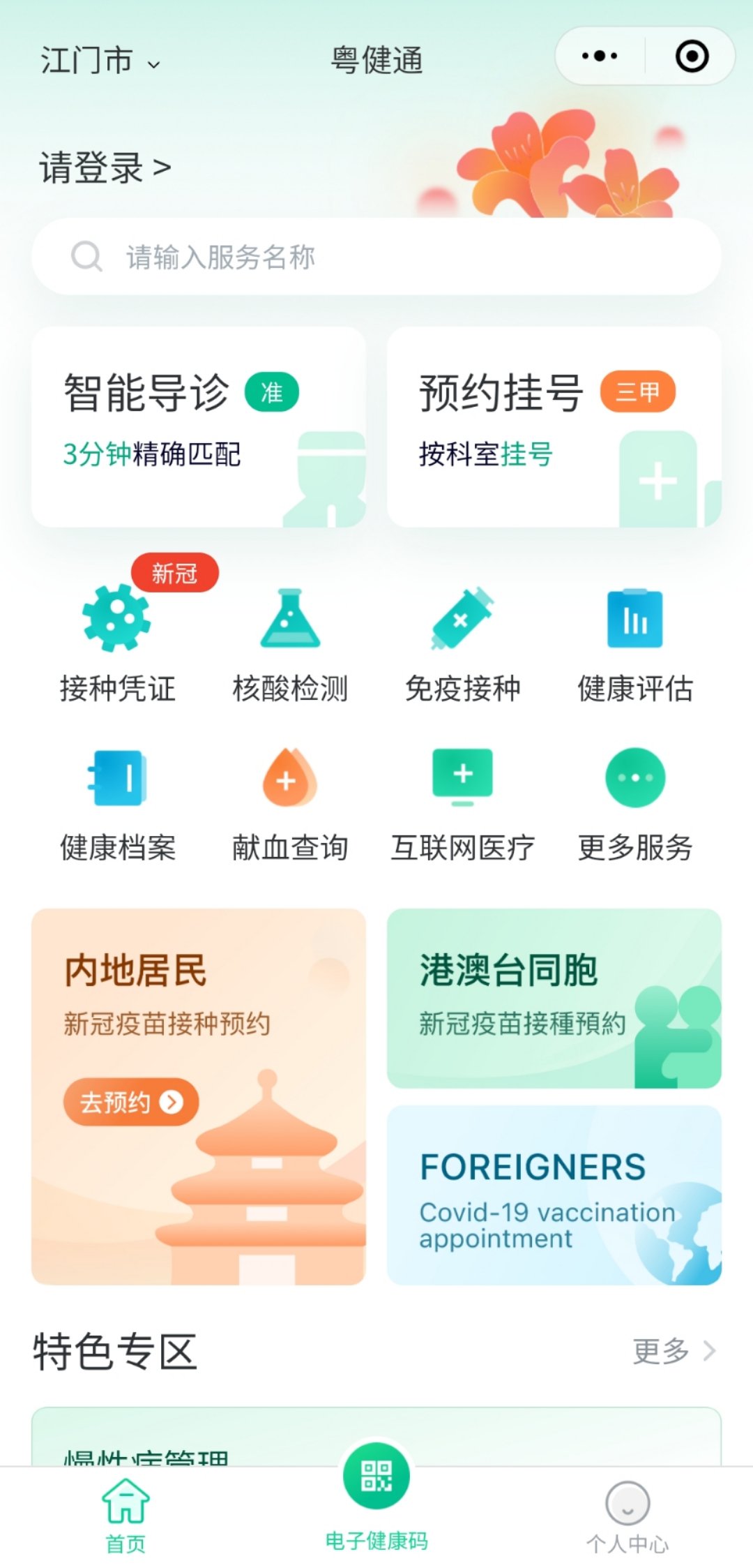 以下为粤健通小程序预约指引第一步:进入“粤健通小程序”小程序,若是首次使用的话,请先注册登录;