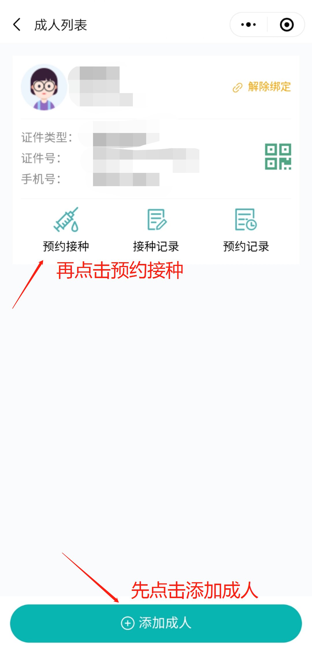 第三步:点击“添加成人”,完成成人信息填写后,点击预约接种;