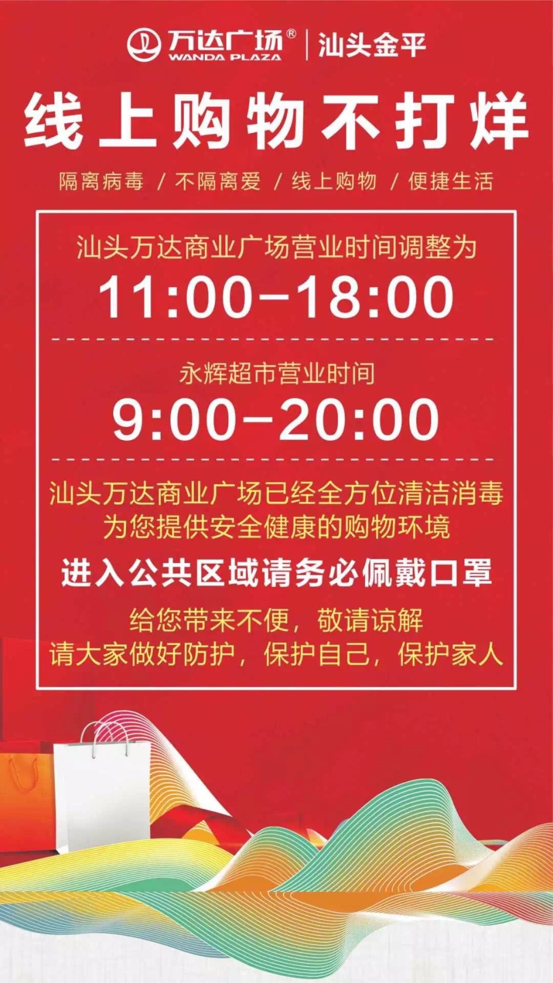 万达广场(金平店):万达广场营业时间改为11:00 - 18:00,永辉超市为09:00 - 20:00