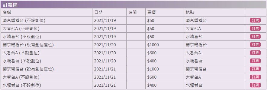 票价:11月19日的票价为澳门元50圆,而11月20日及21日的赛事日的票价则由澳门元400圆至1000圆,价格视乎不同看台而定。