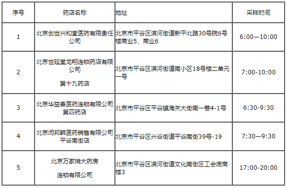 5家药店分别位于平谷城区平谷镇、兴谷街道、滨河街道。5家药店还面向社会公示采样时间,市民可在6:00—10:00、7:00-10:00、6:30-9:30、7:30—9:30、17:00-20:00五个时间段前往药店进行核酸检测,最大限度满足市民群众的多样化时间需求。