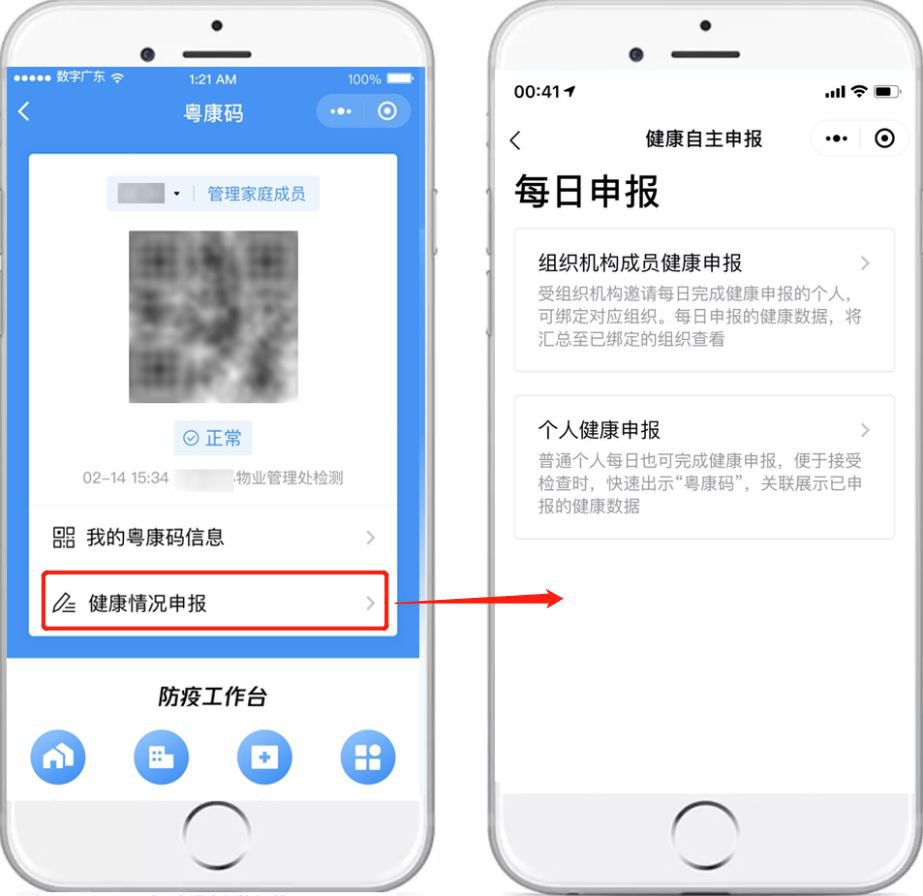 健康申报流程:在“粤康码”展示页面点击“健康情况申报”,可进行健康自主申报,包括“组织机构成员健康申报”和“个人健康申报”,便于接受检查时快速出示“粤康码”,关联展示已申报的健康数据。