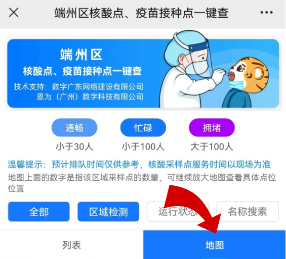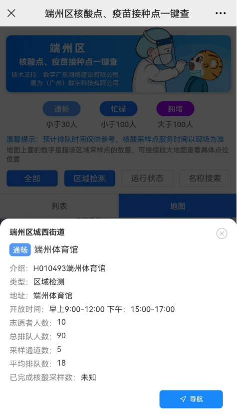 端州区核酸采样点各项数据实时更新,无论是核酸采样点地址分布,或是人员密集状态、服务时间、面向群体、地图定位等重点信息都一目了然,帮助市民及时掌握各个采样点不同时段的拥挤程度。