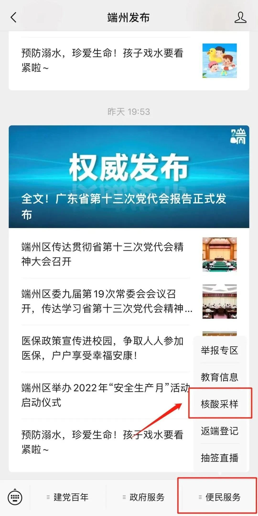 市民可扫描“端州核酸检测点一键查系统”二维码,或通过“端州发布”公众号的“便民服务”栏目——“核酸采样”,即可查询到附近便民核酸采样点实时状态。