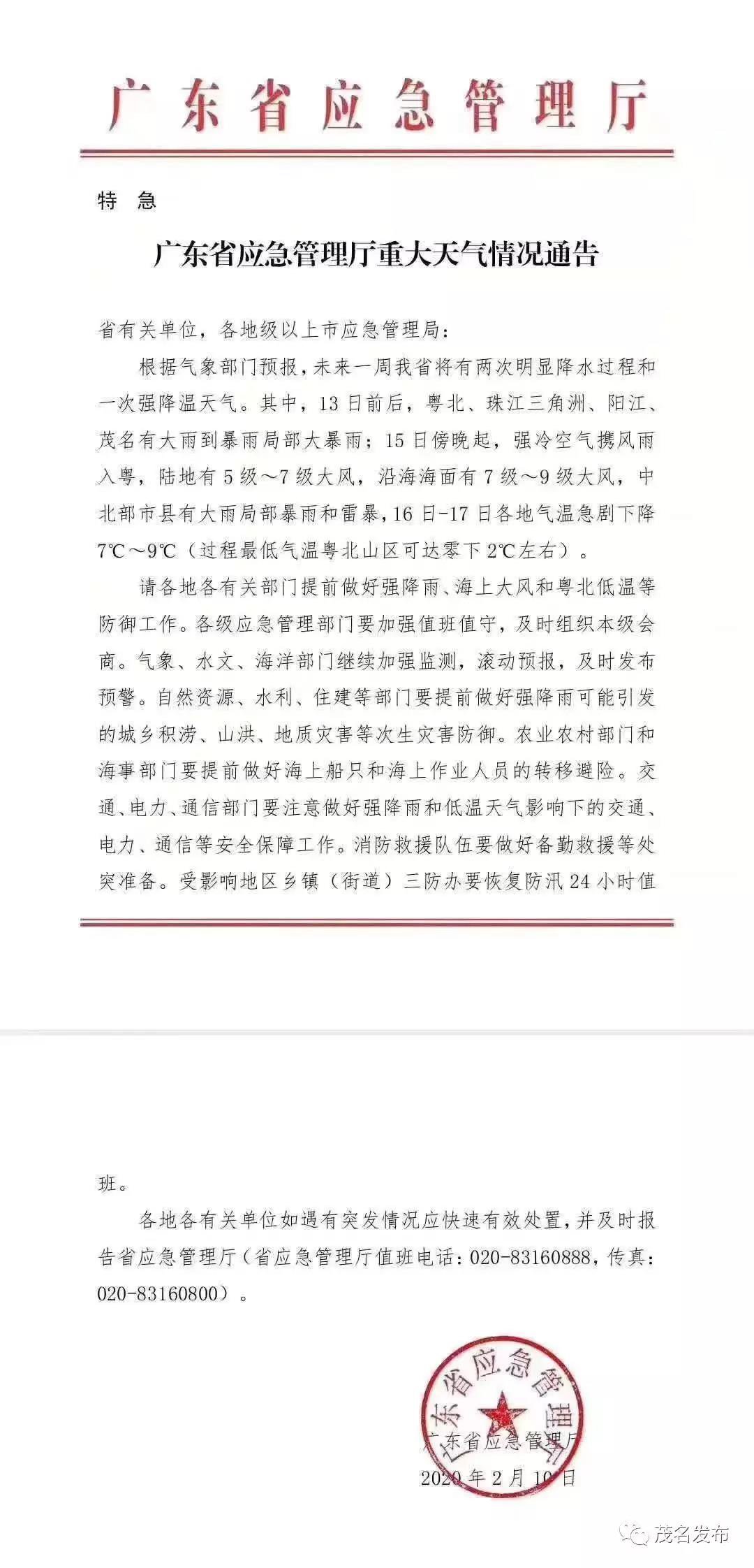 根据气象部门预报,未来一周我省将有两次明显降水过程和一次强降温天气。(茂名天气变化也剧烈→冷空气将携暴雨入粤!茂名天气即将"大变脸",气温最低10℃)2月10日,广东省应急管理厅发布《广东省应急管理厅重大天气情况通告》,请各地各有关部门提前做好强降雨、海上大风和粤北低温等防御工作。