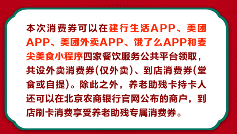 首批餐饮消费券通过建行生活、美团、饿了么、麦尖外卖等平台发放,消费者可登录建行生活APP、美团APP、美团外卖APP、饿了么APP、麦尖美食APP领券。京东、银联等平台也将陆续启动发放消费券。