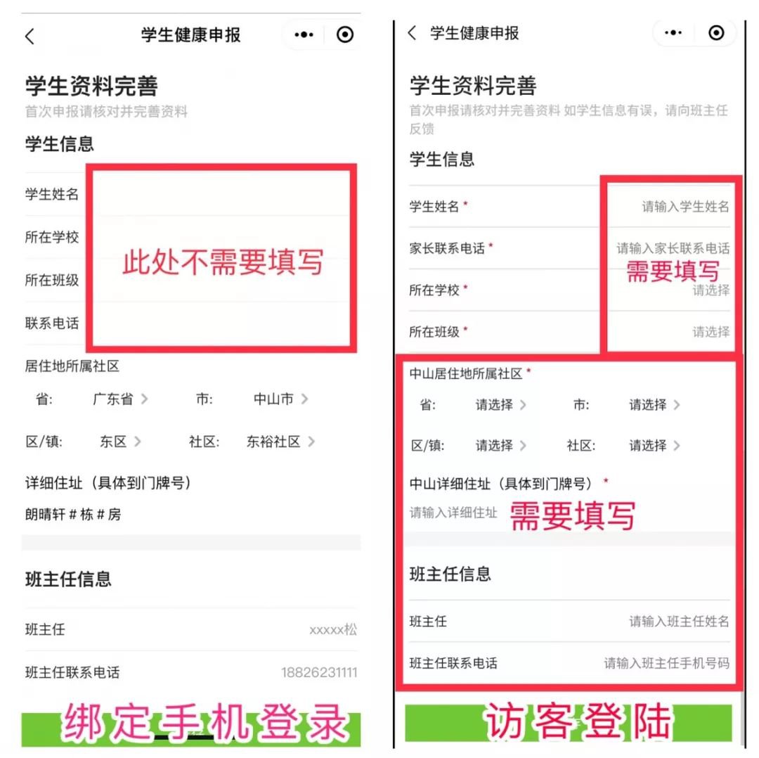注:访客模式进入登录,需要手动填写学生信息(红框内信息)。
