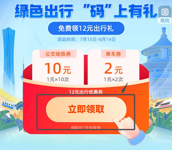 (1)优惠券活动期间用户进入活动页面,可免费领取12元出行礼包,同一用户仅限领取一次,总计发放100万份;
