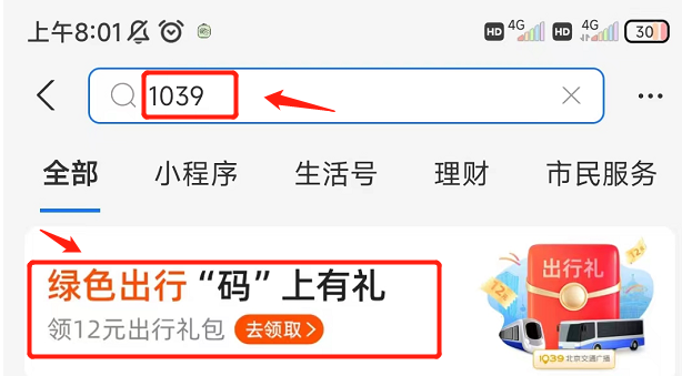 1、进入支付宝APP,搜索“绿色出行”或“1039”