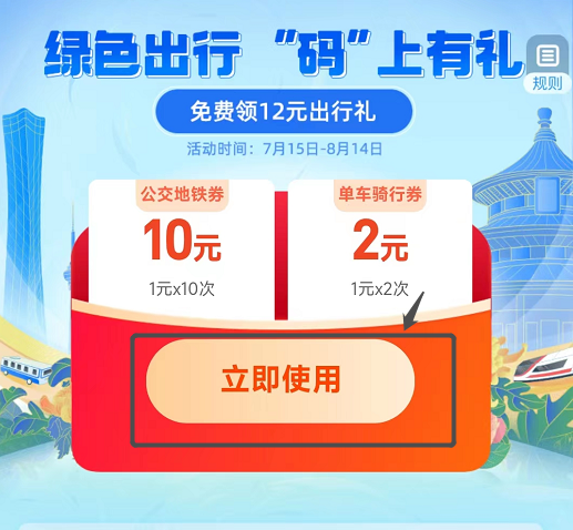 3、领取成功后,可以点击“立即使用”,去使用出行券