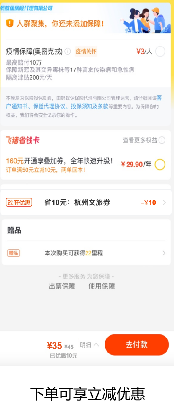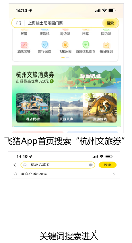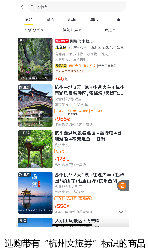 具体方法:手机上打开登陆飞猪App,搜索一个想要去的景区,比如“杭州飞来峰”,选择标注有“杭州文旅券”标识的相关产品后,点击预订,在支付时自动匹配一张满30元减10元的“杭州文旅消费券”,最终实际支付价格为35元。
