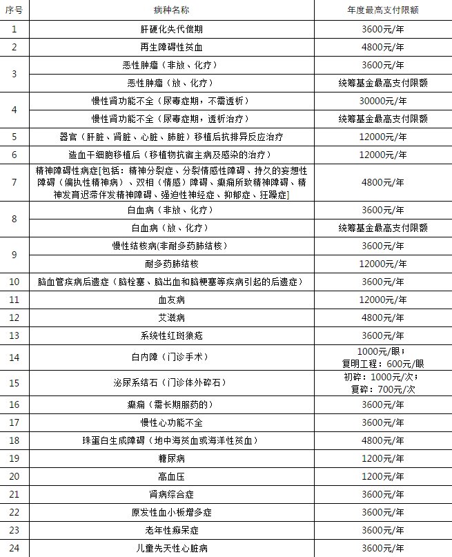 注:白血病(放、化疗)、恶性肿瘤(放、化疗)、慢性肾功能不全(尿毒症期,透析治疗)等不设最高支付限额,病种限在定点医院门诊就诊才能享受门诊特定病种待遇;