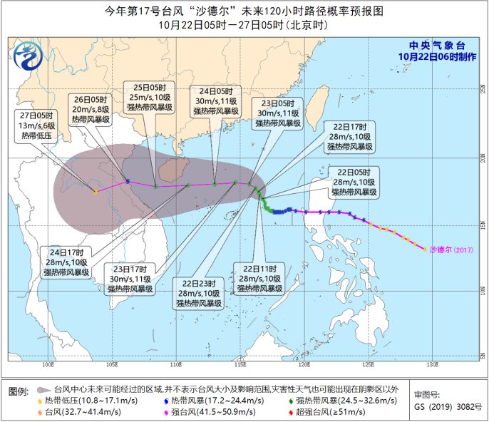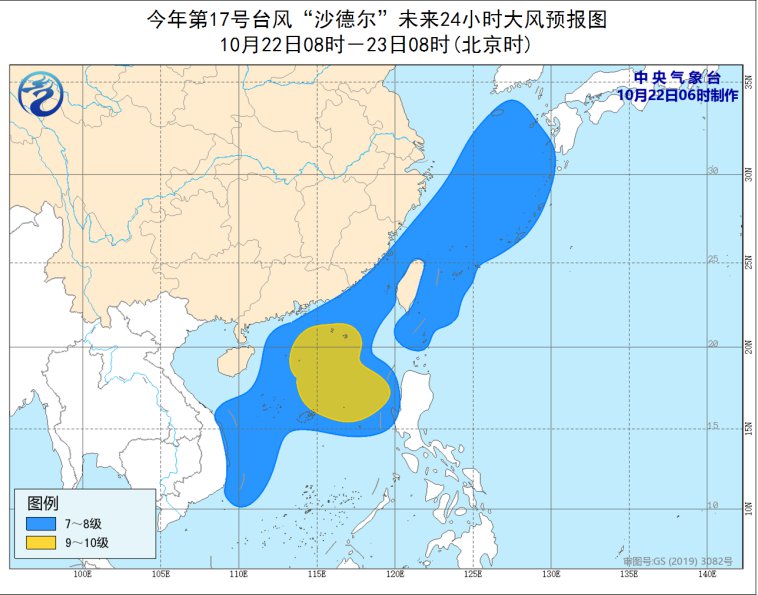 大风预报:受“沙德尔”和冷空气的共同影响,22日08时至23日08时,东海大部有7级大风,台湾海峡、台湾以东洋面、巴士海峡、南海北部和中部、黄岩岛、中沙群岛、西沙群岛以及福建沿海、台湾沿海将有7-8级大风,其中南海东北部和中东部的部分海域风力可达10-11级、阵风12-13级。中央气象台10月22日06时继续发布台风蓝色预警。