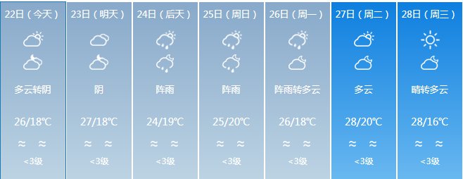 22日 多云转阴 最低气温 18℃,最高气温26℃。