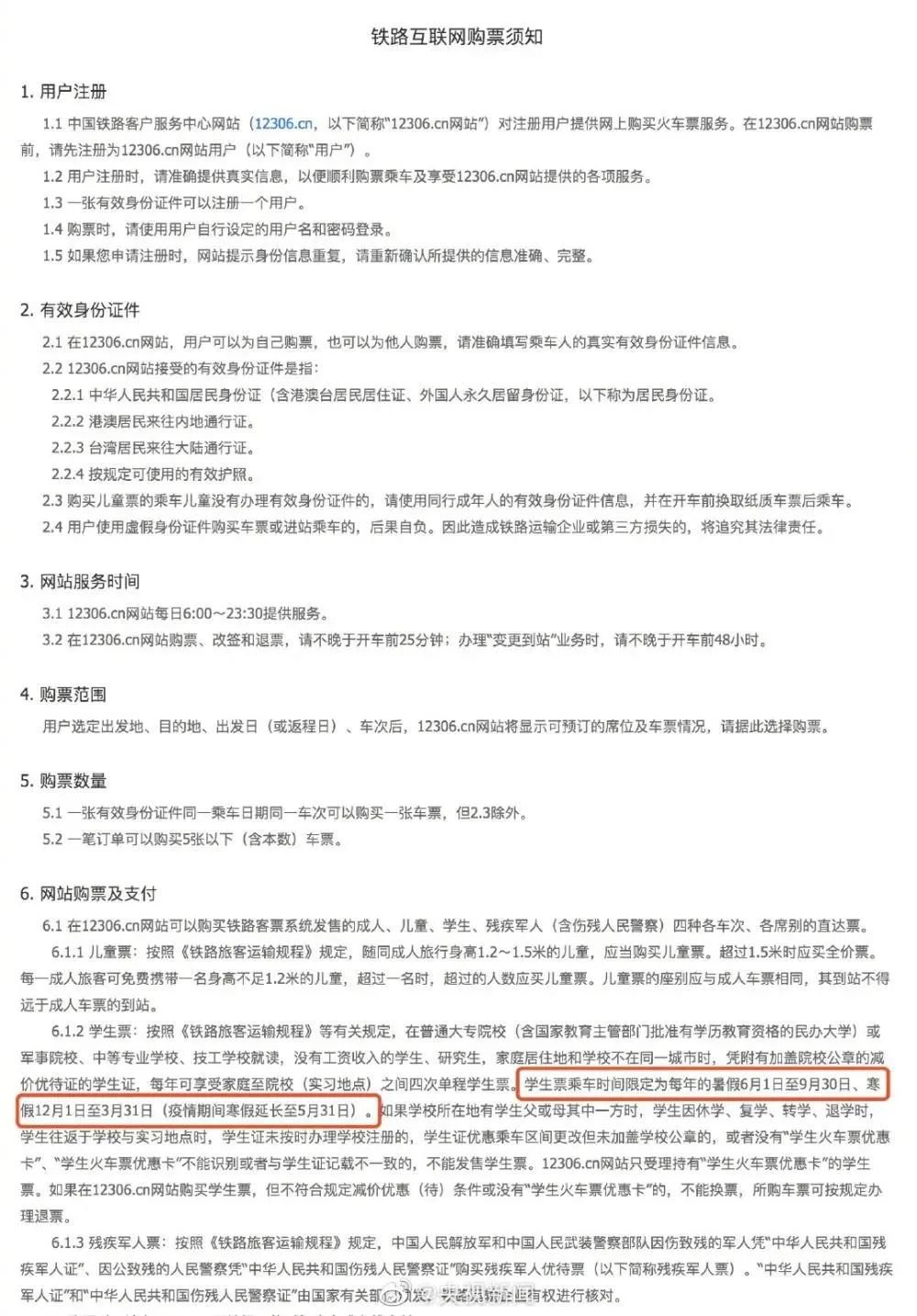 近日,中国铁路12306网站更新《铁路互联网购票须知》:疫情期间,学生票寒假的乘车时间已由12月1日至3月31日延长至5月31日。