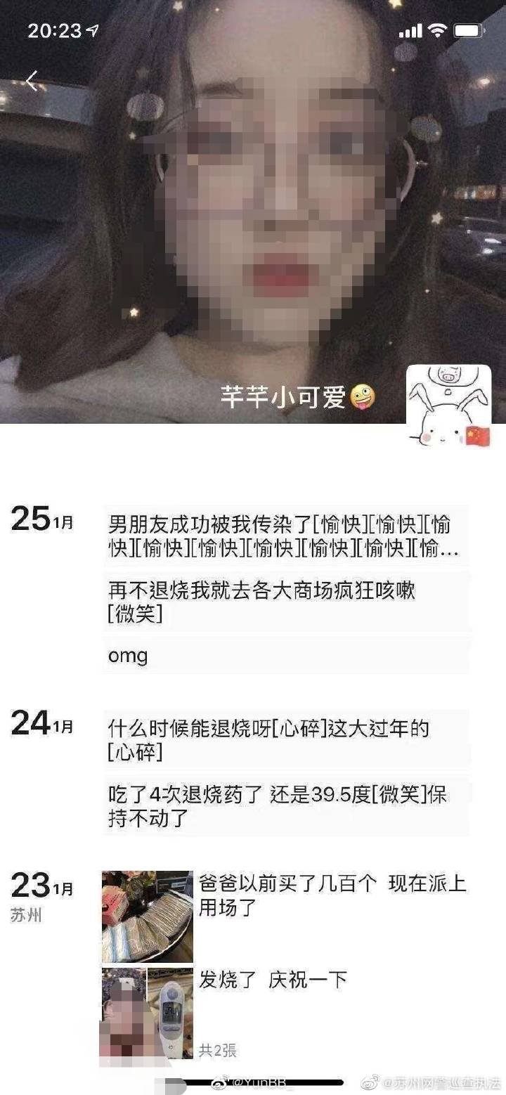 回应:经苏州警方查证,其本人有轻微咳嗽,无发烧现象(有检验报告单,最近都在苏州未离开过),警方已对其普法教育,并告知其不得在网上发表不当言论。称当时发朋友圈是因为生病了寻求安慰,并无其他想法,现该网民已深刻认识到自己的错误。我们再次呼吁广大网民,不造谣,不信谣,不传谣!