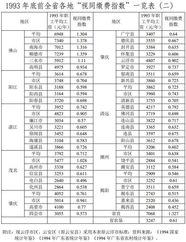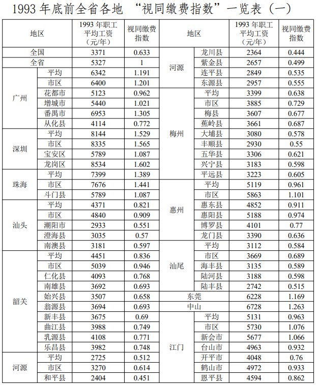 附件:1993年底前全省各地“视同缴费指数”一览表