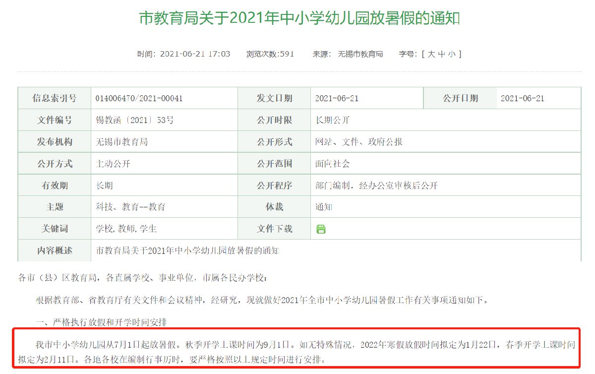根据无锡教育局《市教育局关于2021年中小学幼儿园放暑假的通知》,2021年全省中小学幼儿园暑期放假时间安排在7月1日,秋季开学上课时间为9月1日。如无特殊情况,2022年寒假放假时间拟定为1月22日,春季开学上课时间拟定为2月11日。各地教育行政部门和各中小学幼儿园在编制行事历时,要严格按照以上规定时间进行安排。